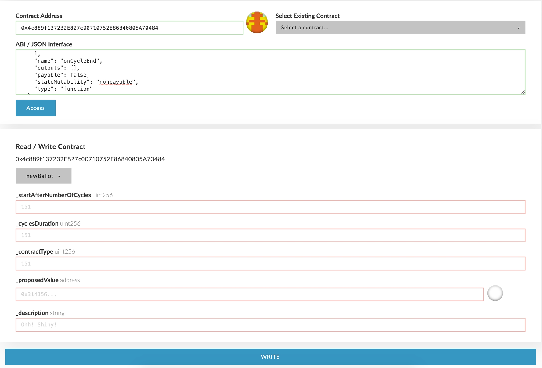 In order to open a new vote, a validator needs to call the `newBallot` function on the voting contract with the following params: