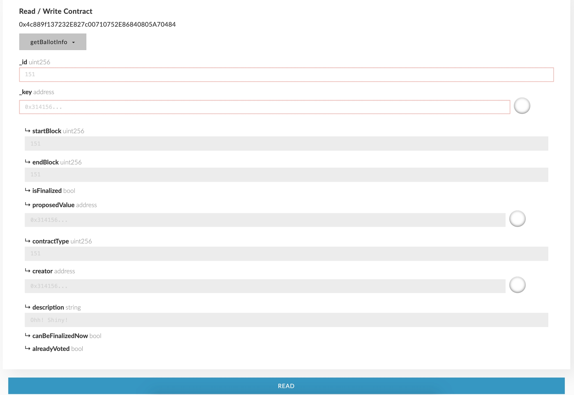 Everyone can check all the ballots that were created using the `getBallotInfo` function. This function receives two params: